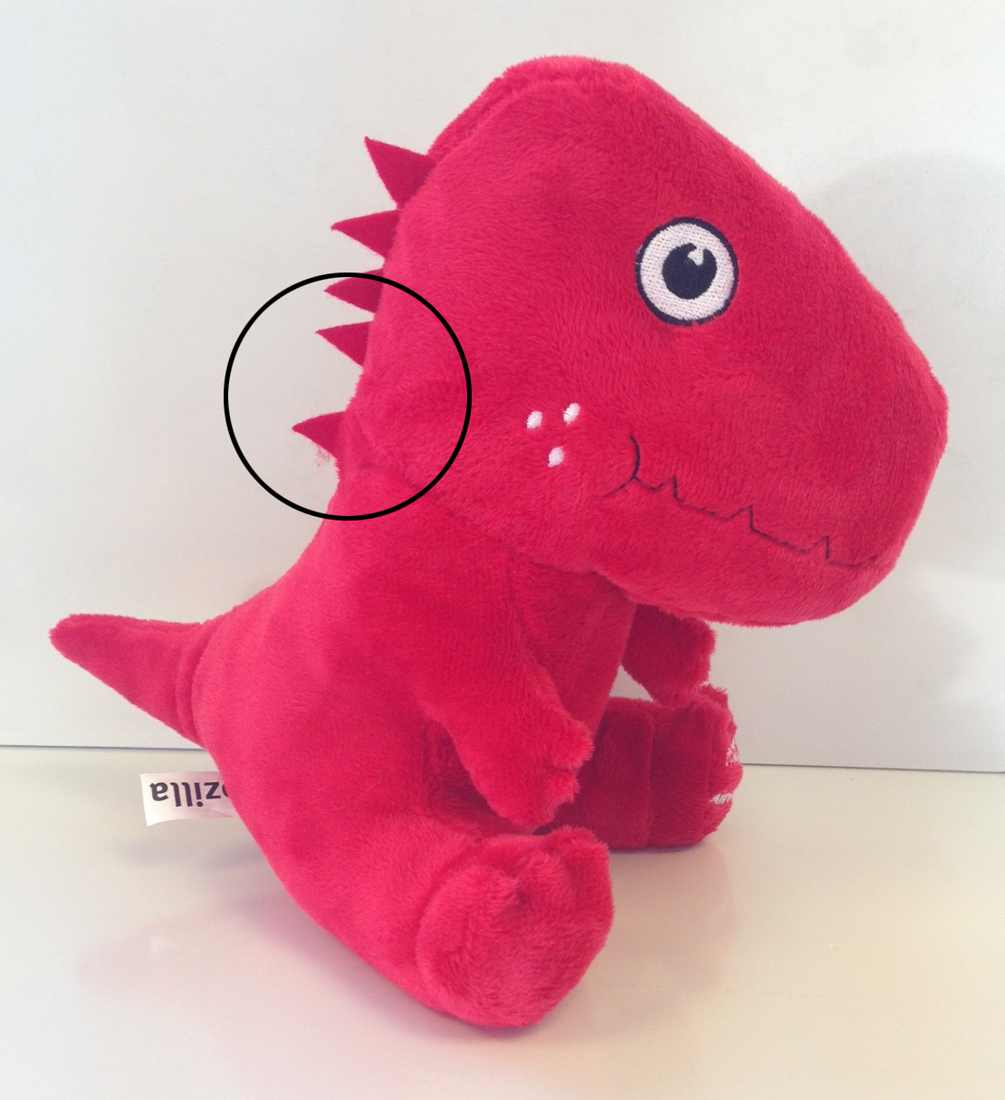 Due to the positioning of the seam between the neck and the body, the last ‘fin’ on the dino is lower than in the original design. See the photo below.