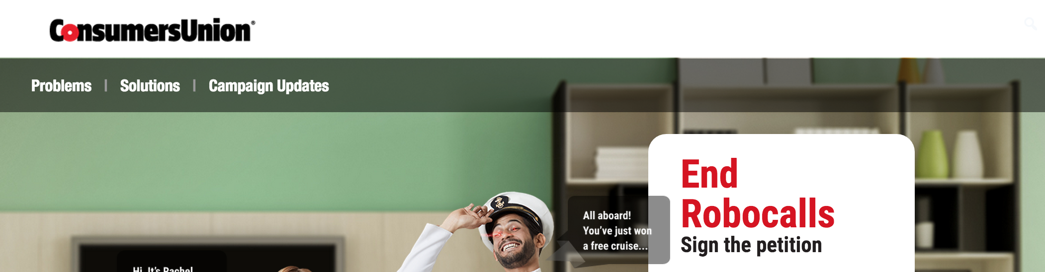 We set up the first web AB test on our End Robocalls site. We chose to optimize for signing the action: completing the white form on the top right. Our guess was the original page design presented too many options to the user. So we built two variants, each of which removed menu options from the top of the site.