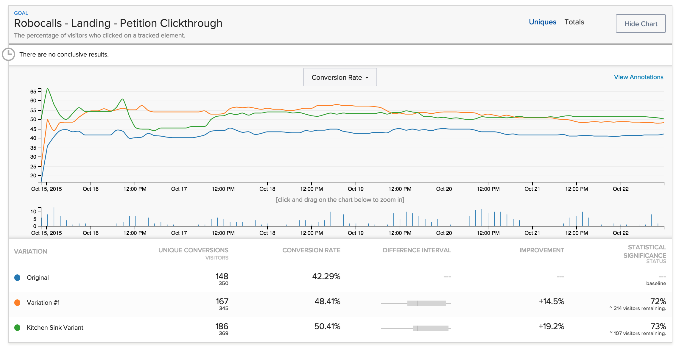 The test has yet to resolve, but it’s exciting none-the-less. We’ve been ramping up our AB testing capacity. We’ve had robust testing frameworks in place around our e-mail program for a while. But we hadn’t brought that rigour across to our campaign page design.